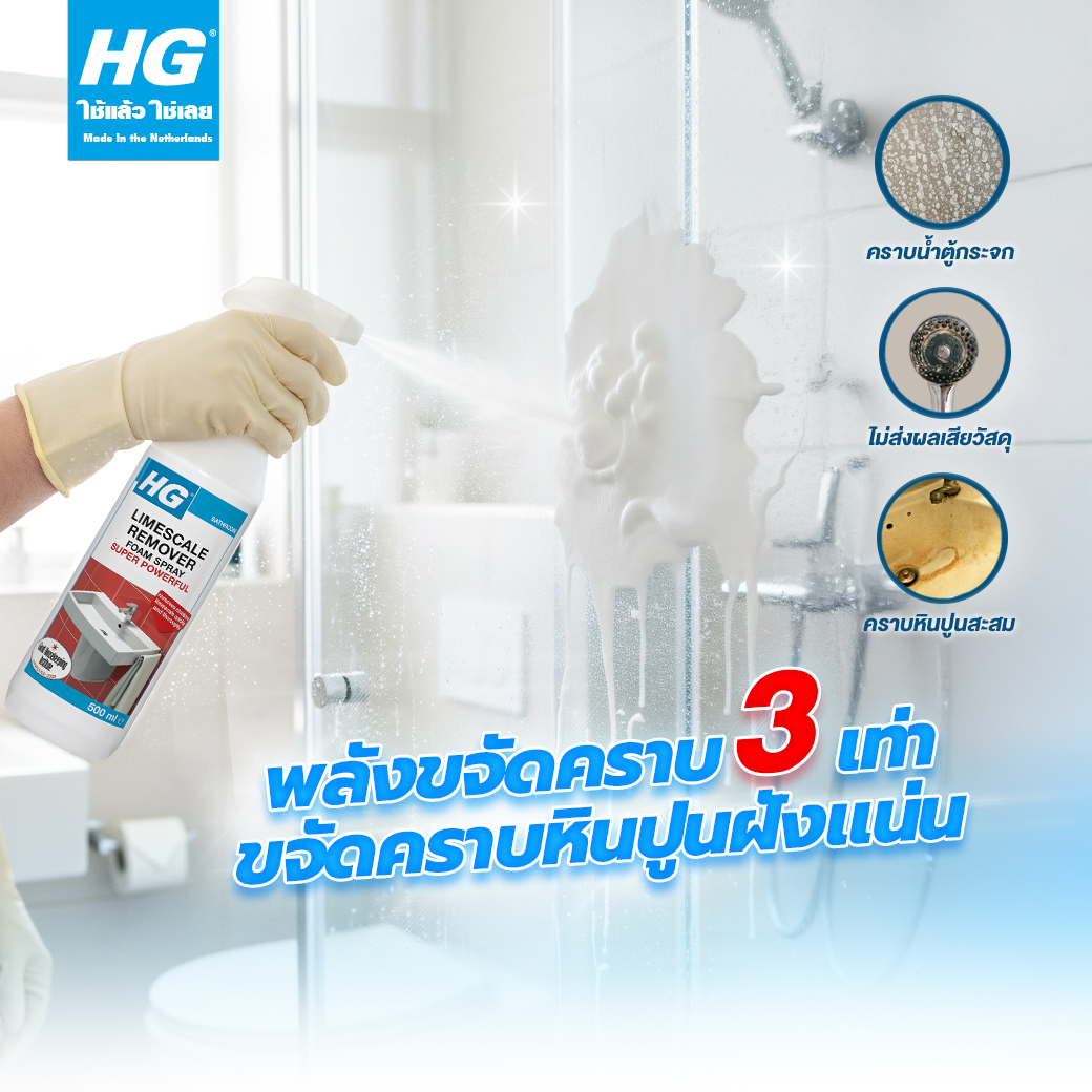 ประโยชน์ : สเปรย์ขจัดคราบหินปูนเพิ่มพลังขจัดคราบถึง 3 เท่าของ เอชจี สเกล อะเวย์ สำหรับขจัดคราบหินปูนที่มาจากน้ำซึ่งเป็นสาเหตุทำให้วัสดุหมองได้อย่างรวดเร็ว ใช้งานง่าย หลังใช้นอกจากขจัดคราบสกปรกแล้วยังทำให้วัสดุวาวเหมือนใหม่ ใช้กับตู้อาบน้ำ, ก๊อกน้ำ, วัสดุต่างๆ (โครเมี่ยม, สแตนเลส, กระจก, พลาสติค, กระเบื้องเซรามิค) เมื่อใช้งานเป็นประจำ ยังช่วยป้องกันการสะสมของคราบหินปูนได้อีกด้วย